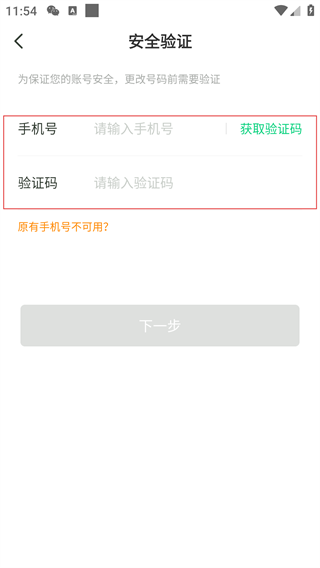 4、在安全验证页面,输入当前绑定的手机号并点击【获取验证码】,填写收到的验证码后点击【下一步】即可进入修改界面。