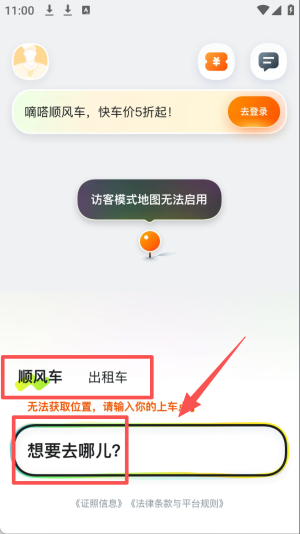 1、选择打车服务:点击“顺风车”或“出租车”选择打车服务。