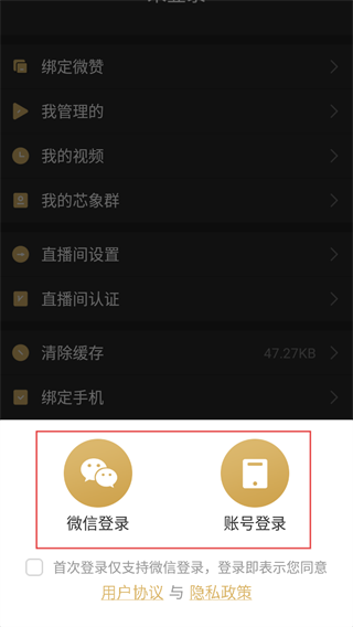 4、在登录选择界面,可选择【微信登录】或【账号登录】,首次登录仅支持微信登录,勾选协议后即可完成登录。