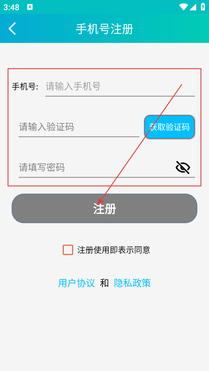 3、在注册界面,依次填入【手机号】【验证码】【密码】,准备完成注册。