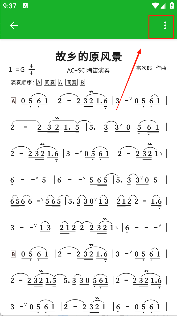 3、查看乐谱详细信息并使用播放功能。在乐谱页面,点击右上角菜单按钮查看更多选项。
