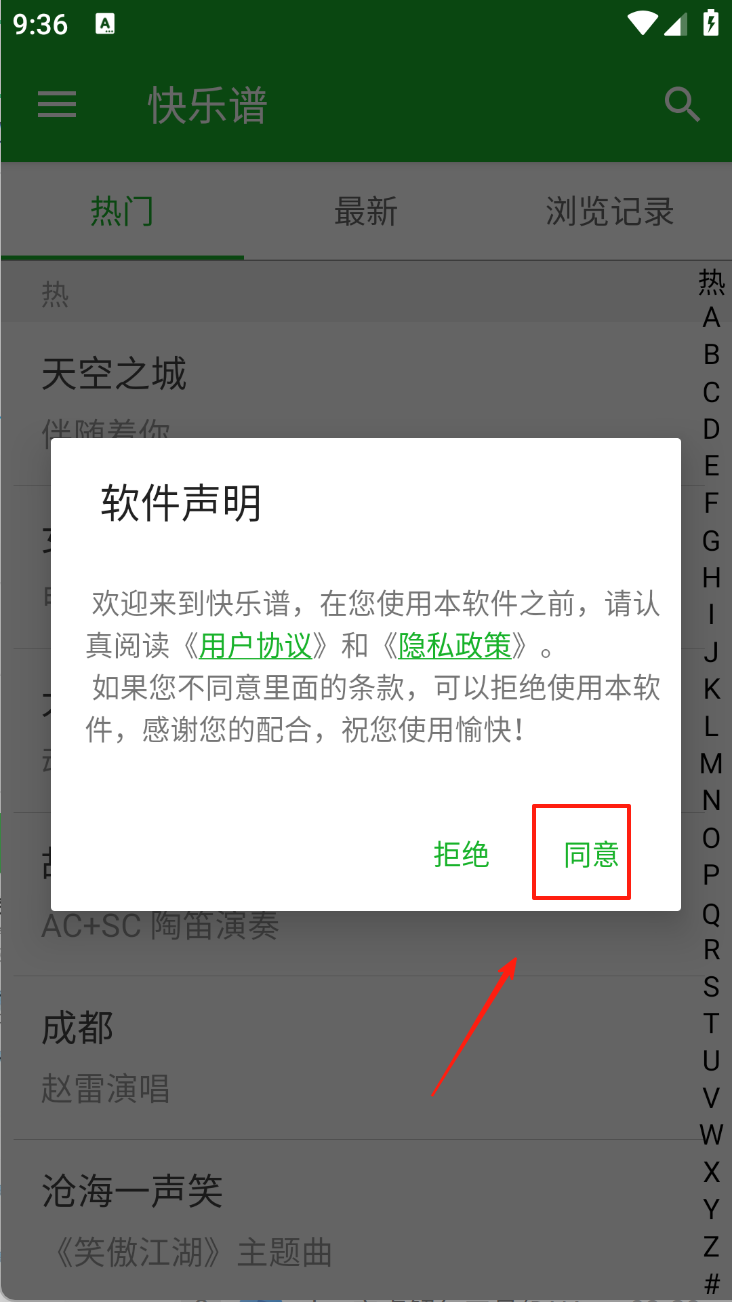 1、阅读并同意软件声明以继续使用。在快乐谱应用中,点击同意按钮以接受用户协议和隐私政策。