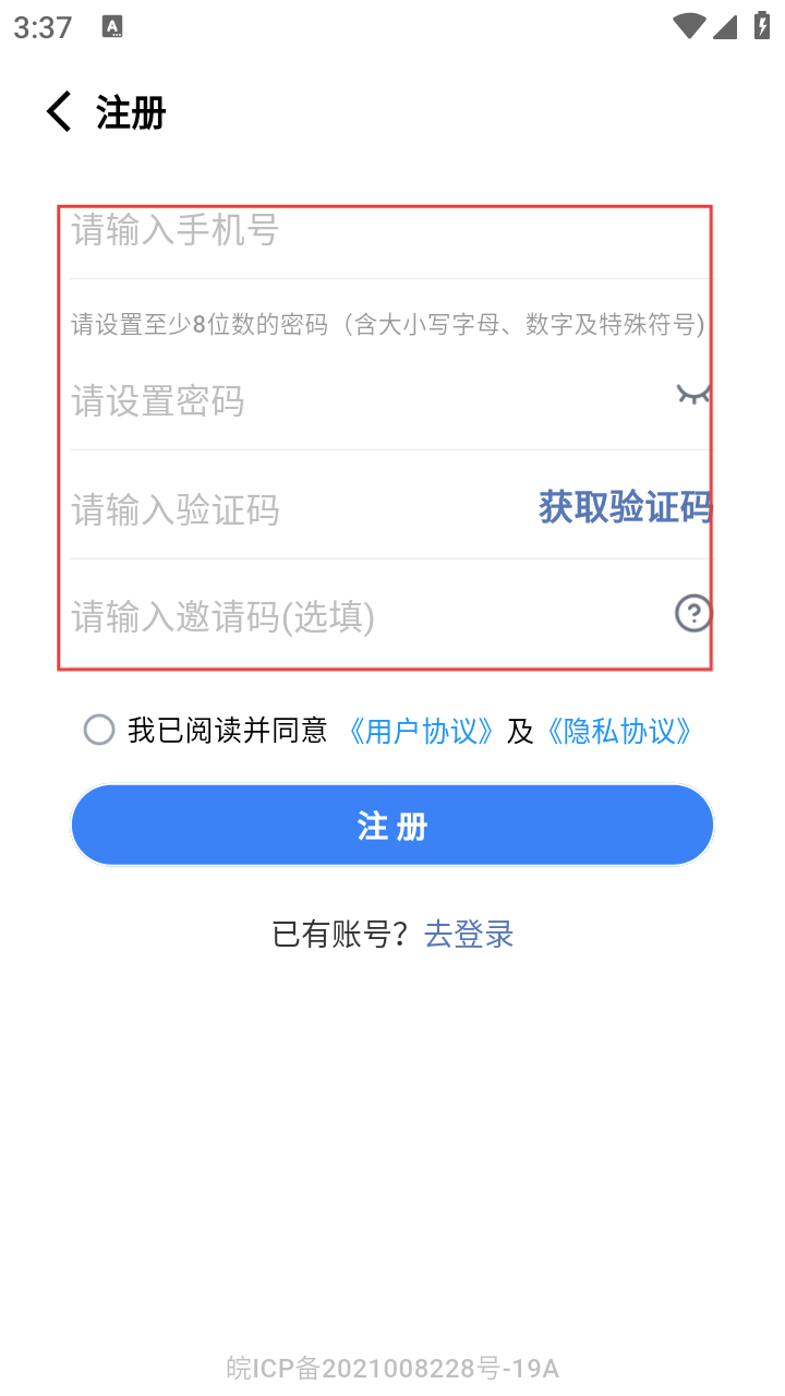 3、注册页按红框要求,填手机号、密码、验证码等信息,准备注册。