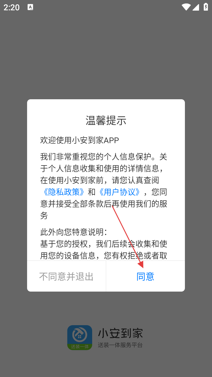 1、使用【小安到家】,点击【同意】接受《隐私政策》与《用户协议》。