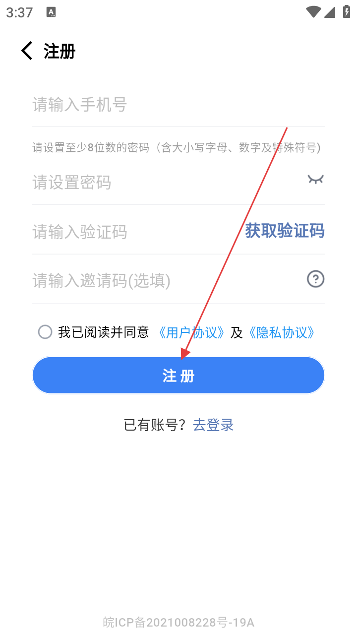 4、填完注册信息并勾选协议后,点击【注册】完成账号创建。