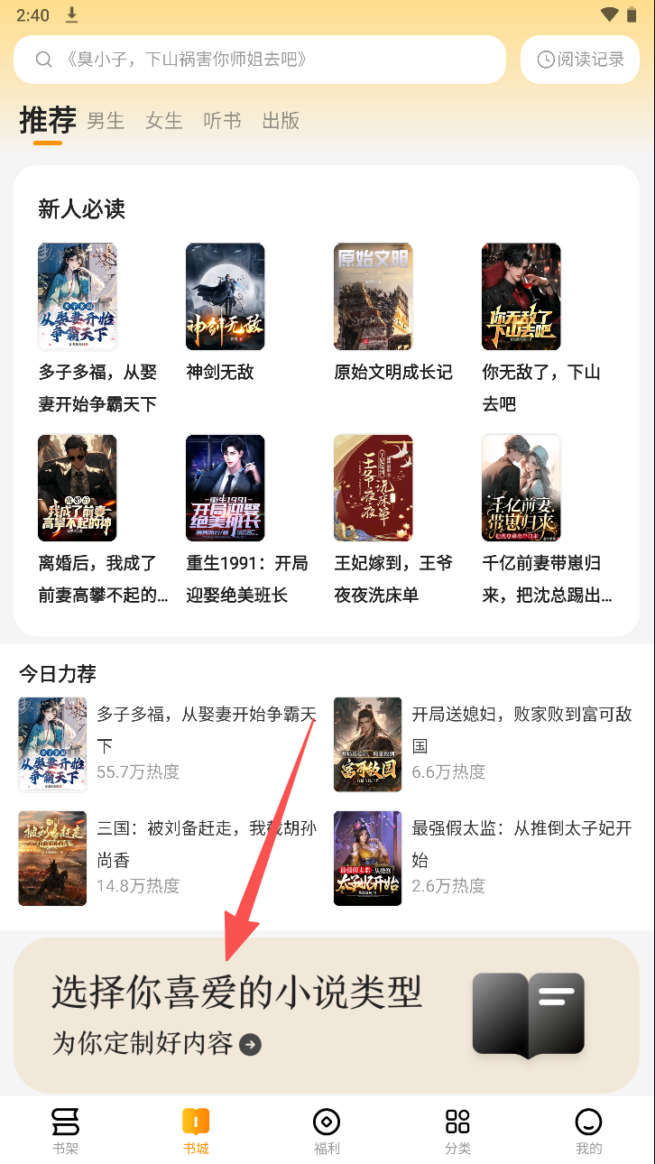 3、在推荐页面选择您喜爱的小说类型,获取个性化推荐。