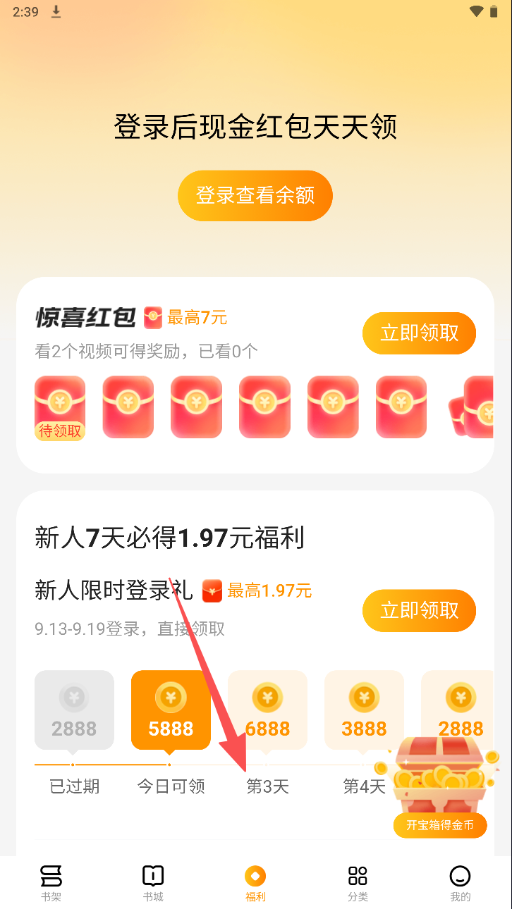 4、登录后领取每日现金红包,享受阅读福利。
