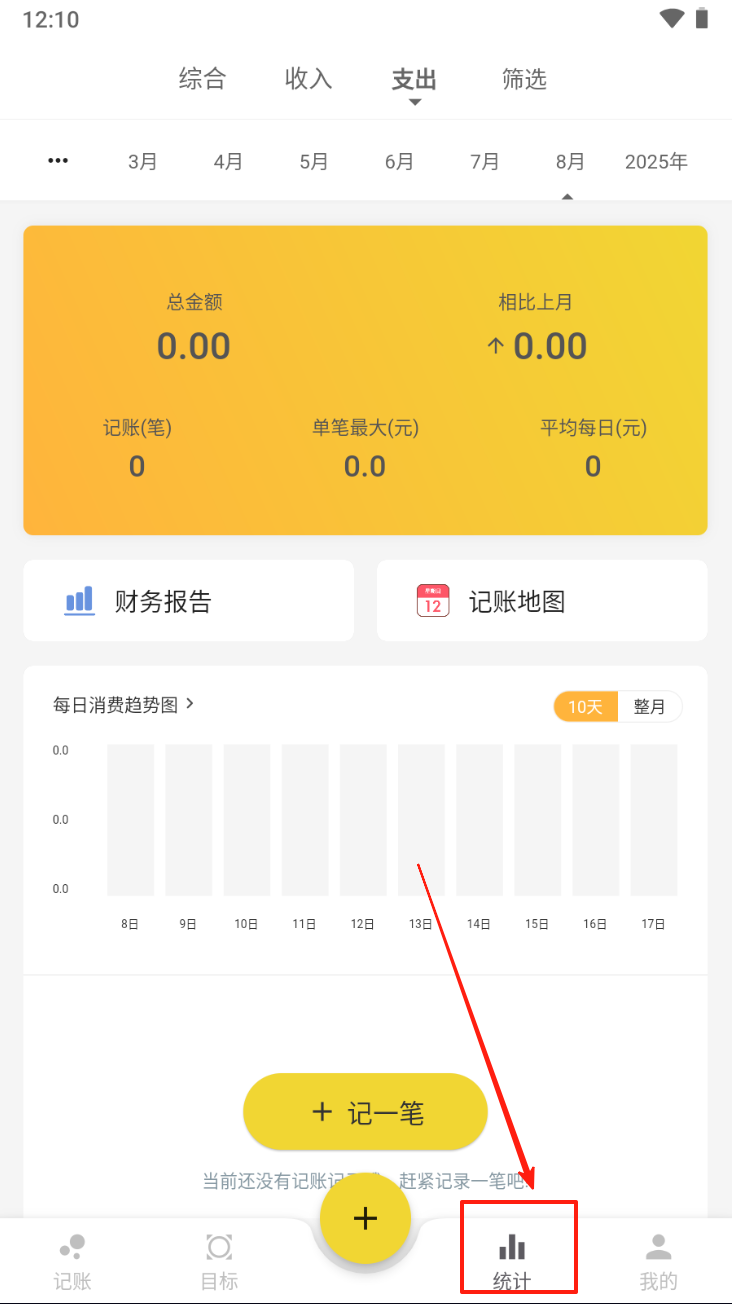 3、查看统计数据。点击“统计”图标,查看您的财务报告和消费趋势图。