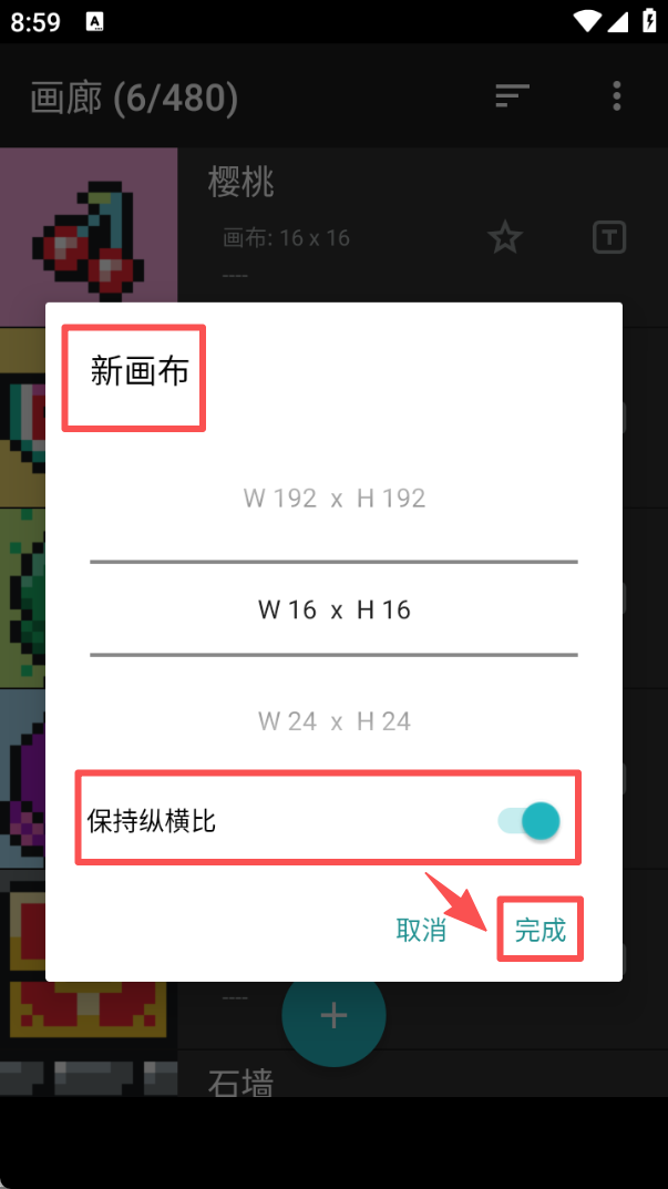 2、在新画布设置弹窗中,选择合适的画布尺寸,开启 “保持纵横比” 后点击 “完成”,创建新画布。