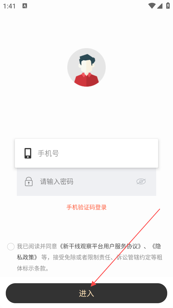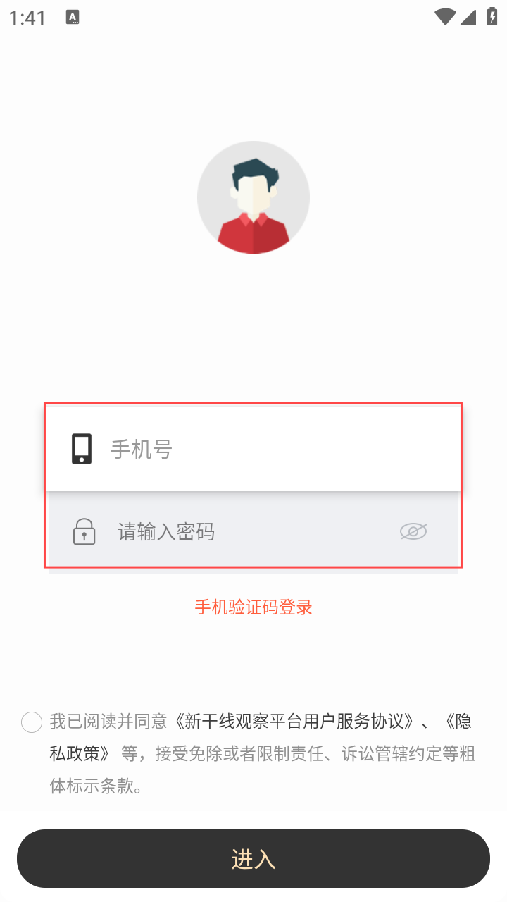 1、首次使用新干线观察,需阅读用户协议及隐私政策,点【同意】进入登录环节。