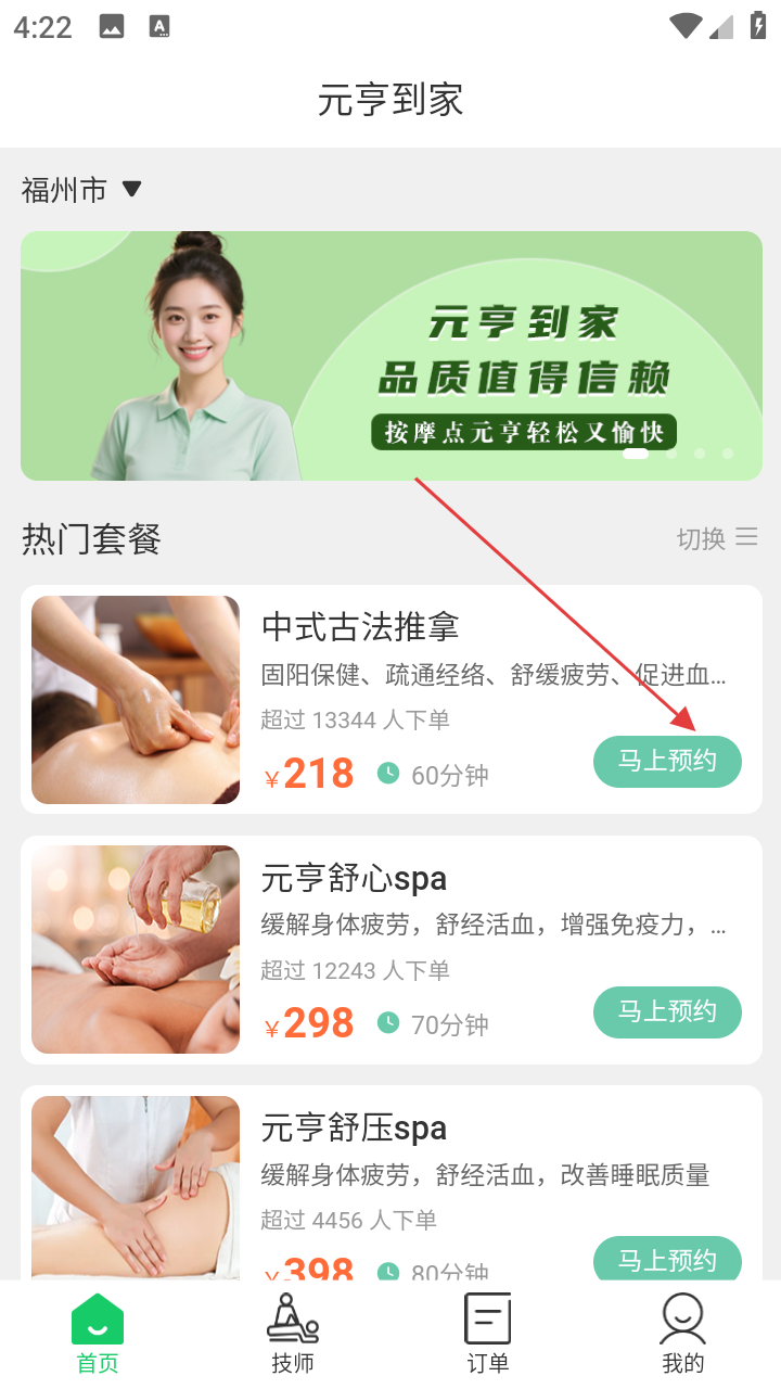 1、进入【元亨到家】平台,找到热门按摩套餐区域,选择【中式古法推拿】等目标套餐。