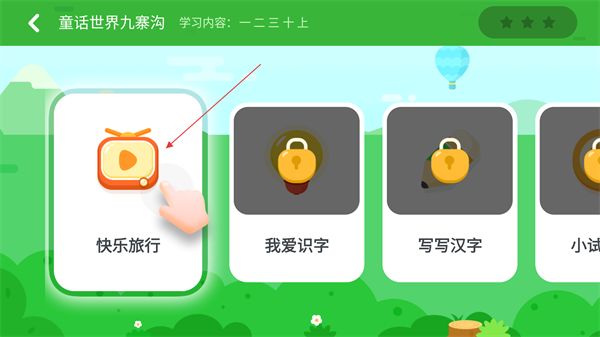 3、在“童话世界九寨沟”学习模块中,可点击“快乐旅行”开启对应课程,其余模块需解锁后使用。