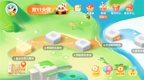 1、在首页点击头像,可进入任务中心等功能页,首页还提供打卡任务、优惠券等入口,以及“童话世界九寨沟”等学习模块。