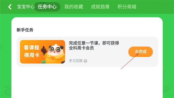 2、进入【任务中心】后,新手任务“看课程得周卡”可通过完成任意一节课获取全科周卡会员,点击“去完成”即可推进任务。