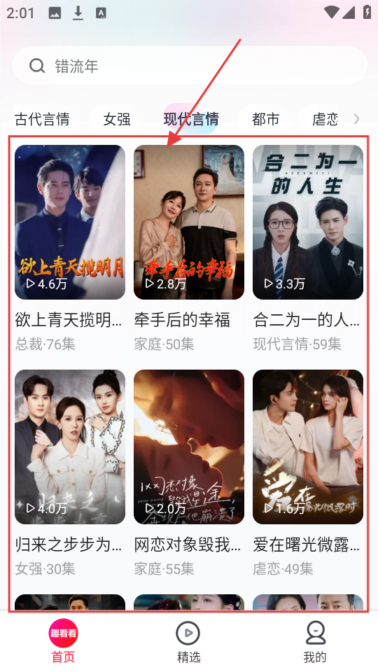 1、在首页选择喜欢的分类,如【现代言情】等,可筛选出对应类型的短剧哦。