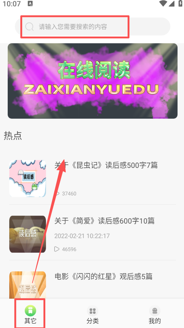 1、进入 “其它” 页面,在搜索栏输入内容查找资源,也能浏览热点板块里的读后感、观后感类内容。