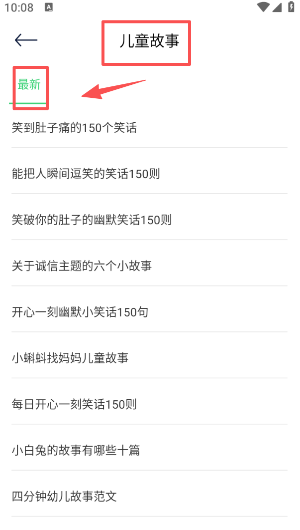 3、打开儿童故事页面,在 “最新” 标签下,可浏览笑话、诚信主题故事等儿童向的内容资源。