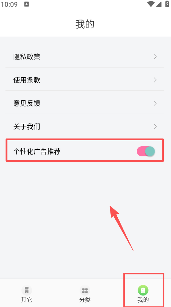 4、进入 “我的” 页面,找到 “个性化广告推荐” 选项,可通过开关按钮调整该功能的开启状态。