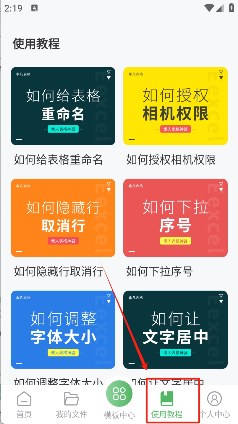 3、在“使用教程”页面学习如何重命名表格、授权相机等操作。
