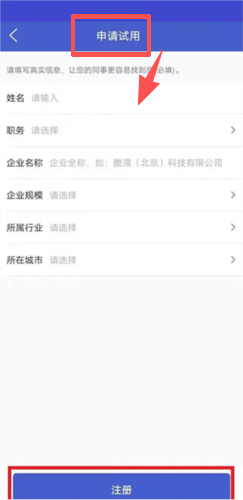 3、进入信息填写页,依次补充姓名、职务、企业名称等信息,确认无误后点击 “注册”,完成申请试用流程。