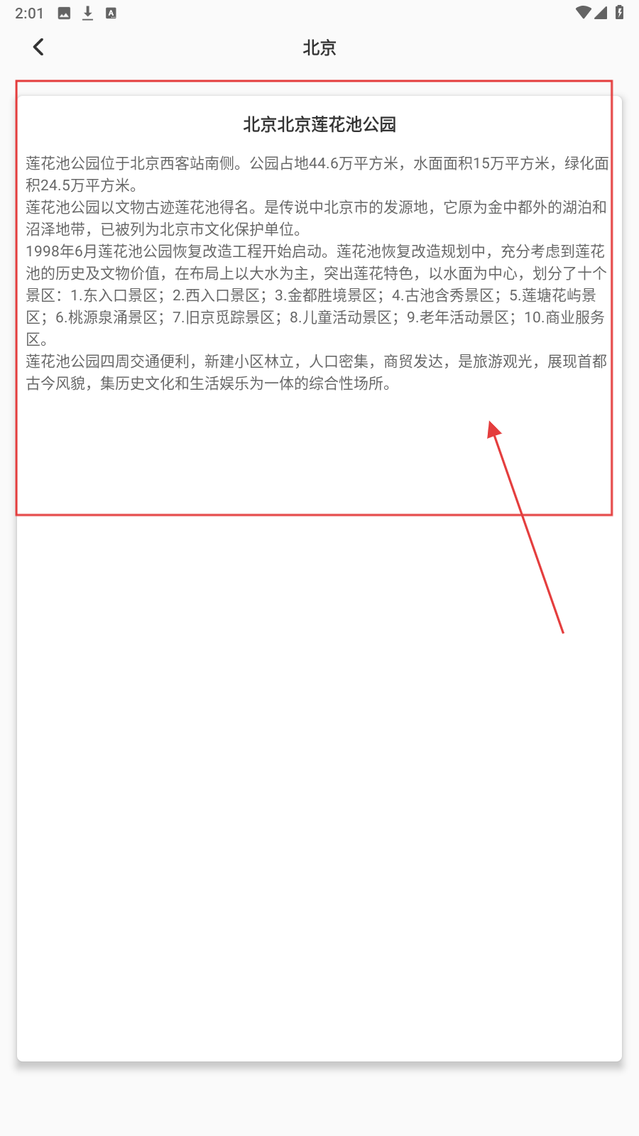 点进具体景区,比如【北京莲花池公园】,仔细阅读详细介绍,了解地址、特色等信息,为旅行提供帮助。