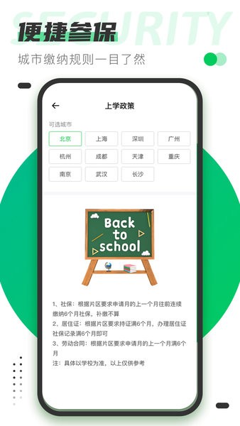 提供不同城市参保规则及居住证、劳动合同等细则的查询服务