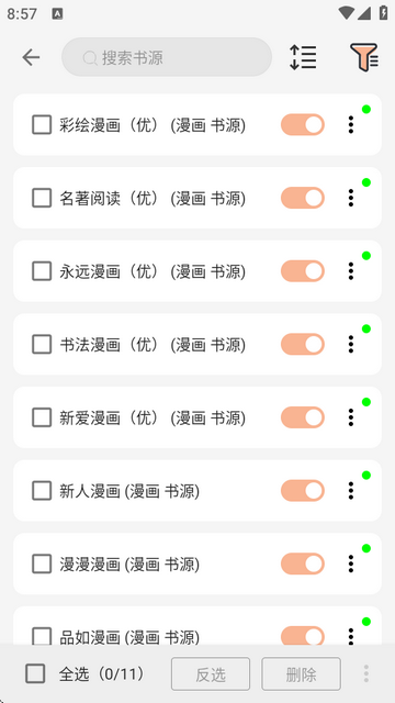 手动挑选想要启用的漫画源,接着对这些漫画源执行批量启用操作。
