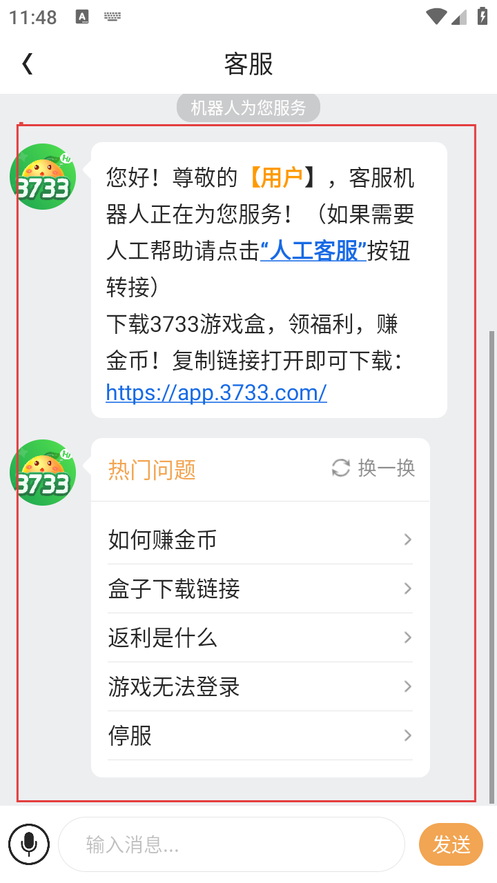 4、进入客服交流页面后,可与客服机器人对话,获取帮助,也能查看热门问题解答。