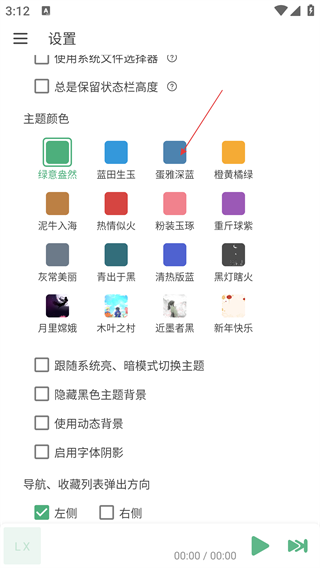 3、在【设置】界面的主题颜色设置中,可选择【蛋雅深蓝】主题颜色,调整软件界面风格。
