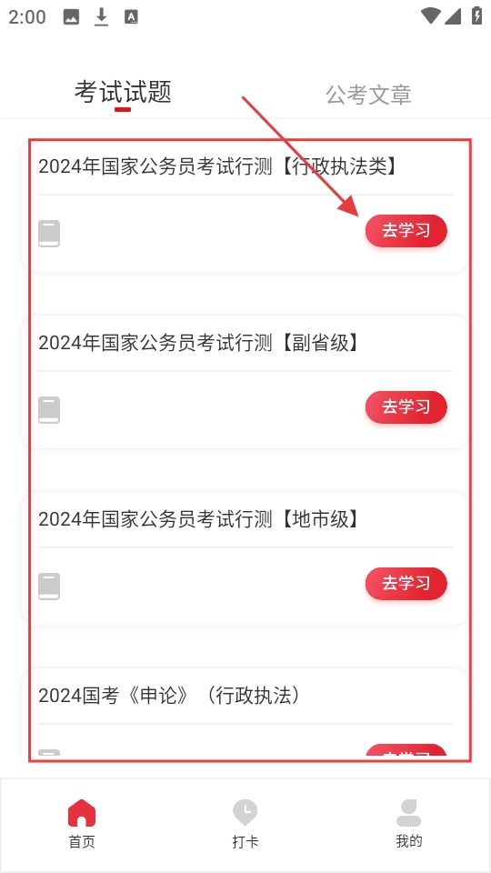 考试试题页面包含多种类型的国考行测、申论试题,若想学习,点击对应的【去学习】按钮即可。