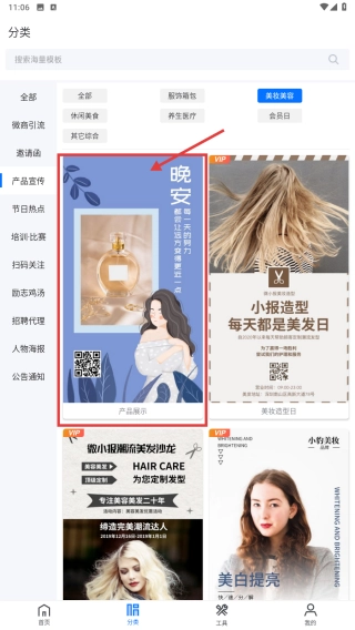 在美容类产品宣传模板的列表里,找到对应的目标模板,就能把它用在美容产品的宣传设计工作中。