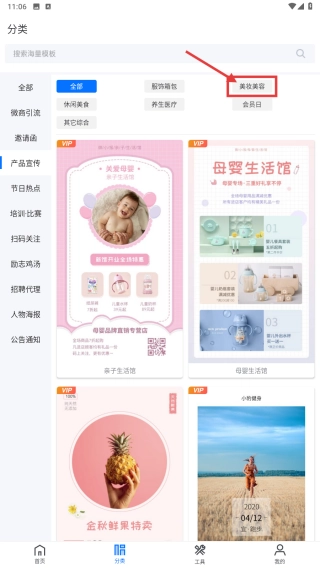 在产品宣传分类里,点击其他美容子分类,就能查看美容类产品的宣传模板。