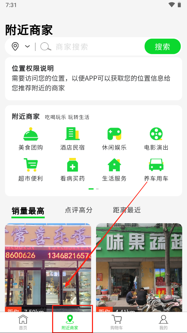 1、打开应用首页,点击“附近商家”按钮,进入附近商家列表,查看附近的商家信息。