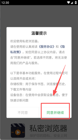 1、阅读协议点击“同意并继续”,授权存储权限后即可进入私密主页。