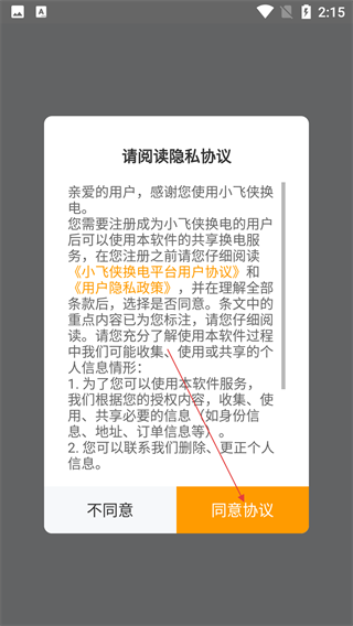 1、使用【小飞侠换电】前,需阅读【用户隐私政策】,明确信息收集与管理规则后,点击【同意协议】进入应用。