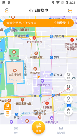 2、进入【小飞侠换电】主界面,通过地图查看换电点分布,点击底部【换电】按钮可发起服务。