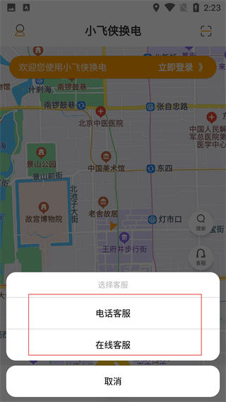 3、在主界面中点击客服按钮,可选择【电话客服】或【在线客服】,咨询换电相关问题。