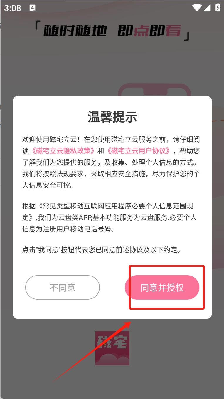 1、首先,点击“同意并授权”按钮以接受磁宅立云的隐私政策和用户协议。