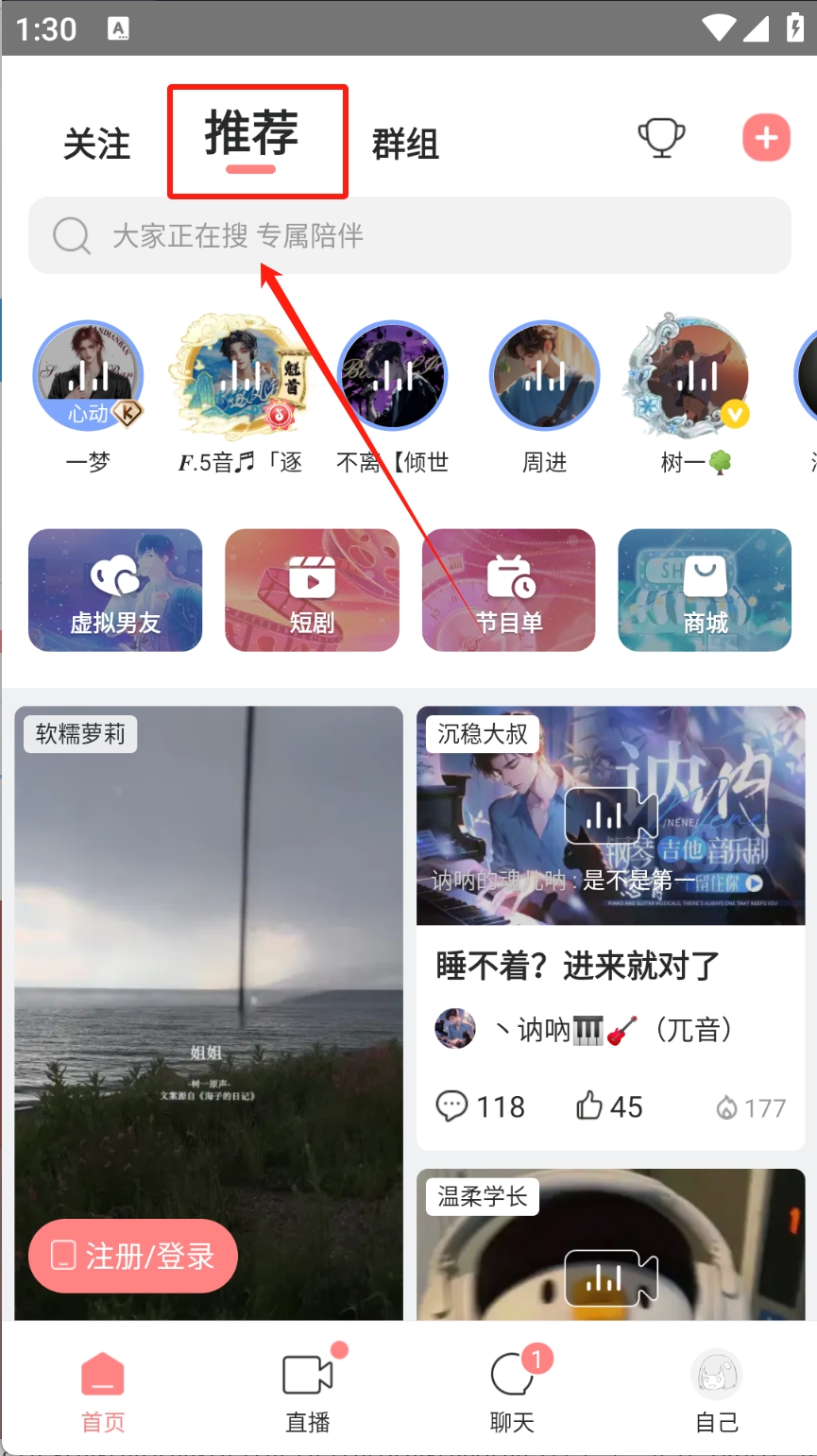1、浏览推荐内容:点击“推荐”查看热门内容和直播。