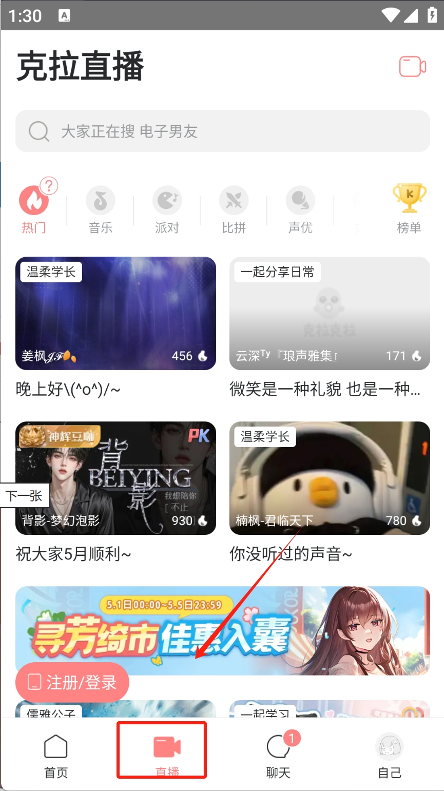 2、观看直播:点击“直播”进入直播间,享受互动乐趣。