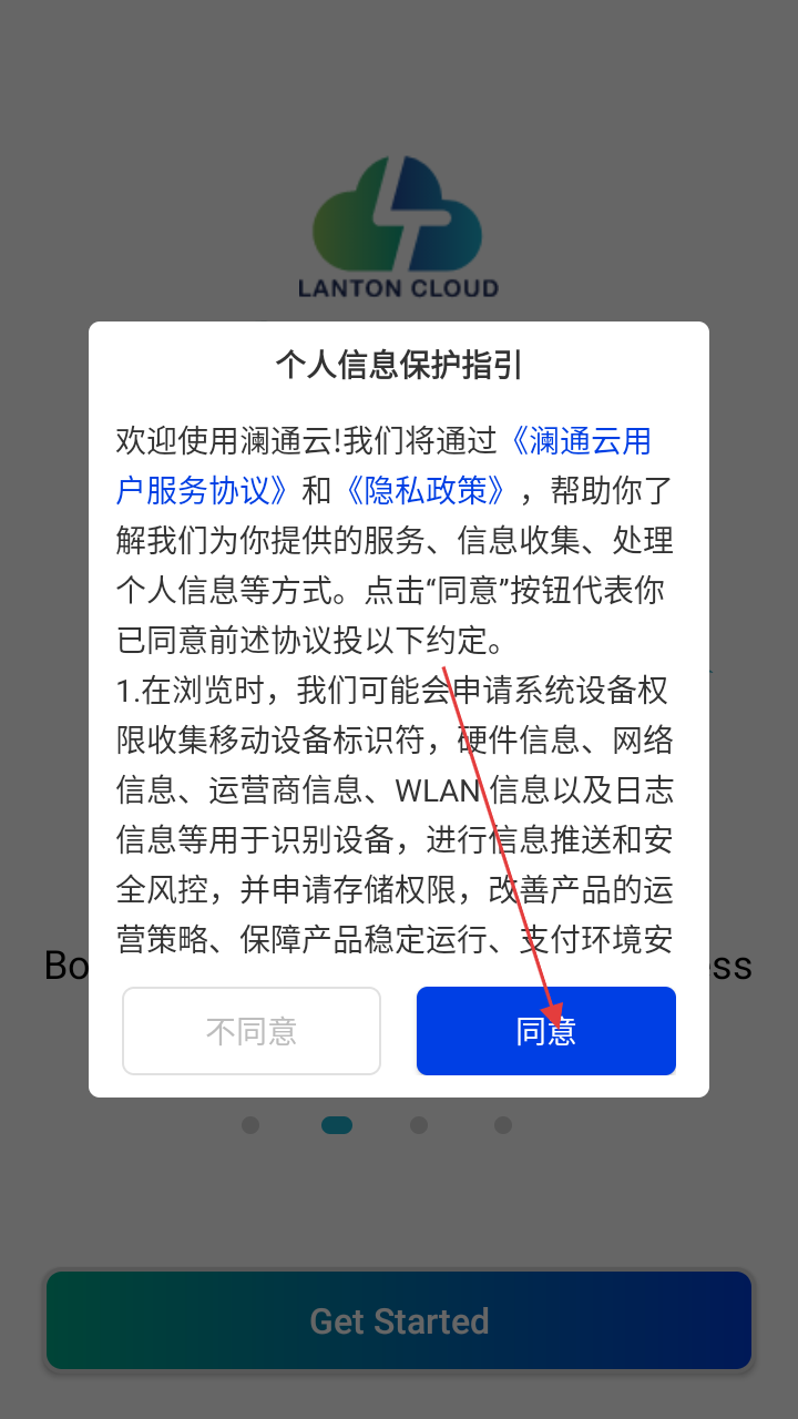 1、打开澜通云APP,在弹出的个人信息保护指引弹窗中,点击【同意】按钮。