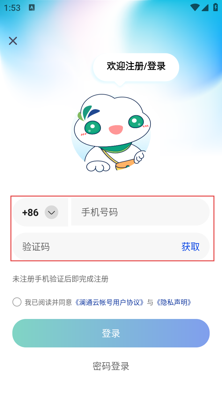 4、进入注册/登录页面,输入手机号码,点击【获取】验证码,输入验证码,点击【登录】,即可完成注册/登录操作,使用澜通云APP。