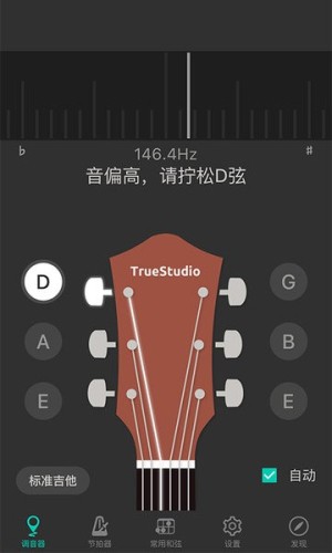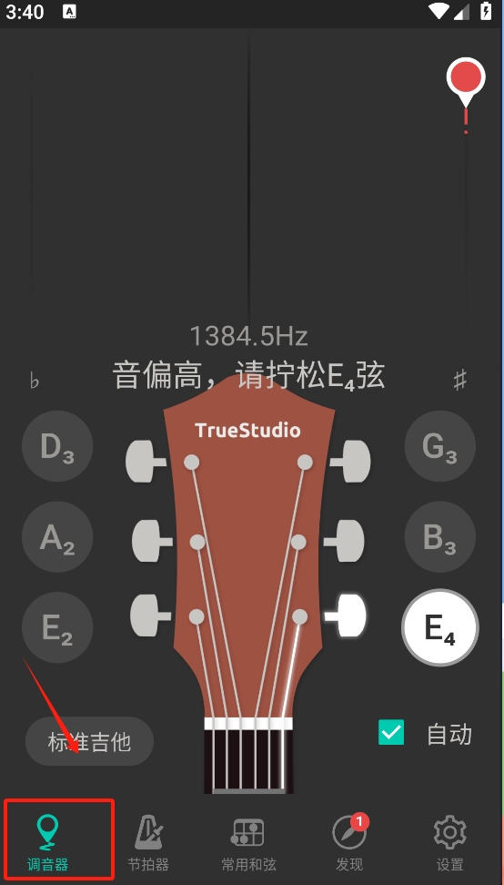 1、打开调音器功能,查看当前吉他弦的音高,并根据提示调整琴弦。