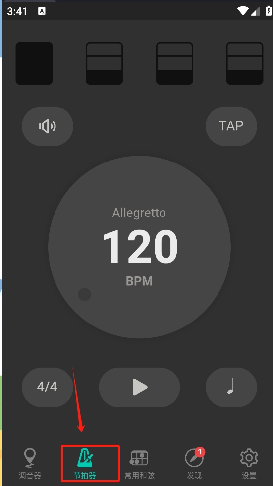 2、进入节拍器页面,设置所需的节拍速度和拍号。