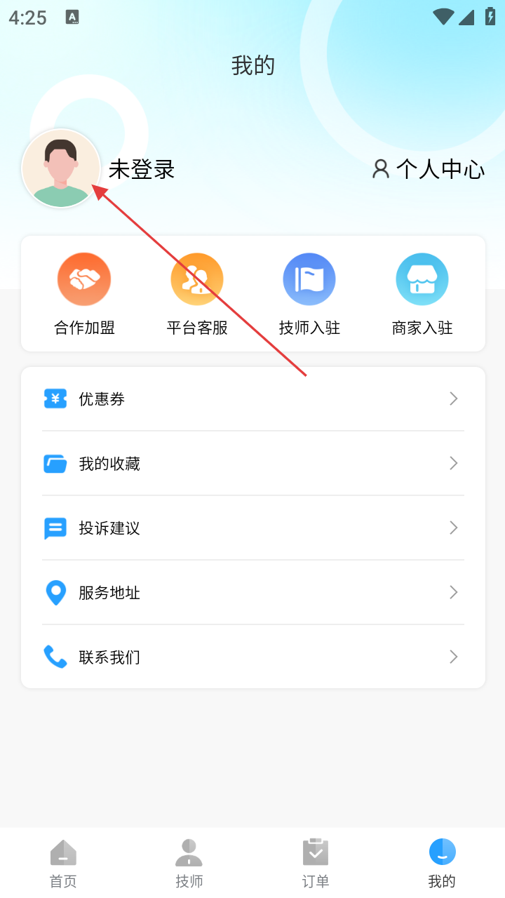 2、在“我的”页面,点击显示“未登录”的头像区域,进入登录页面。