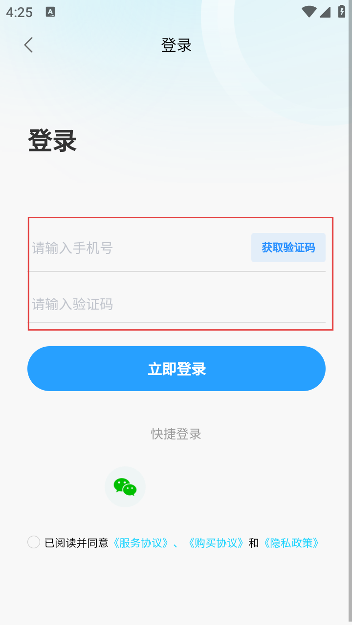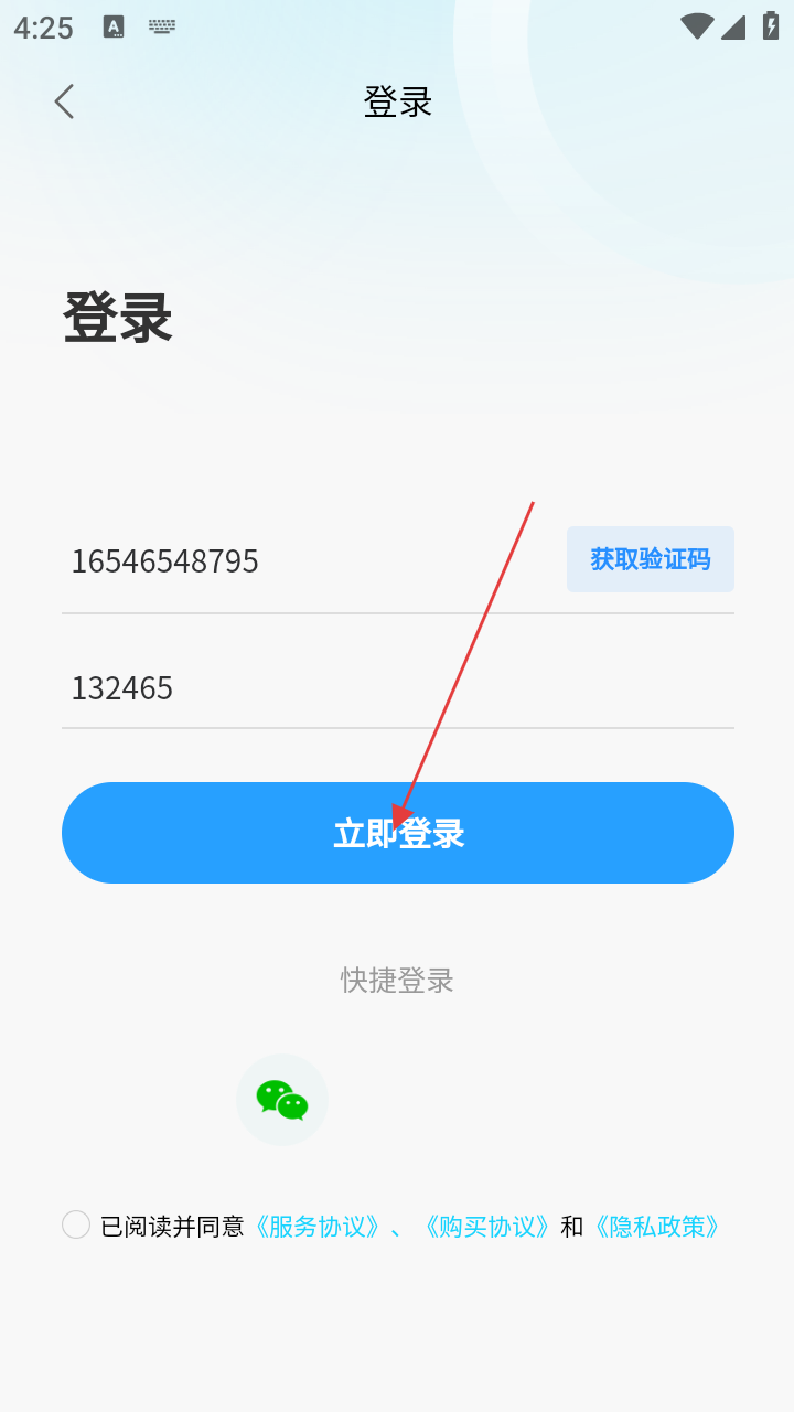 4、勾选【已阅读并同意《服务协议》、《购买协议》和《隐私政策》】后,点击【立即登录】按钮,完成APP的登录操作。
