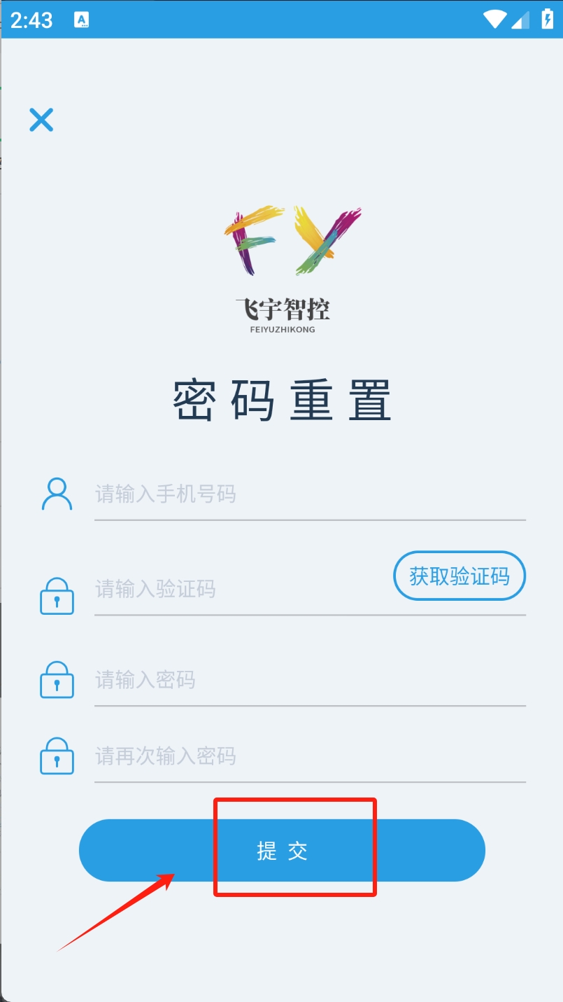 3、如需重置密码,在密码重置页面输入手机号和验证码,设置新密码后点击“提交”。