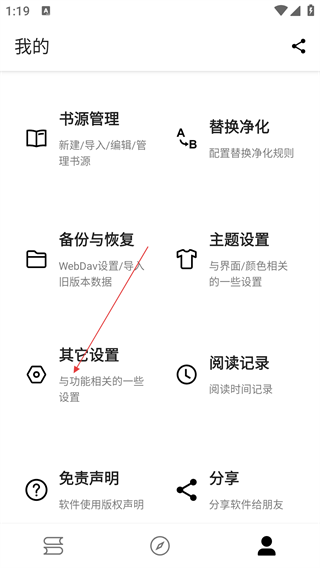 5、进入我的栏目,包括书源管理、替换净化、备份与恢复、主题设置、其他设置、阅读记录等分栏,这里以书源管理为例,教大家如何导入书源,