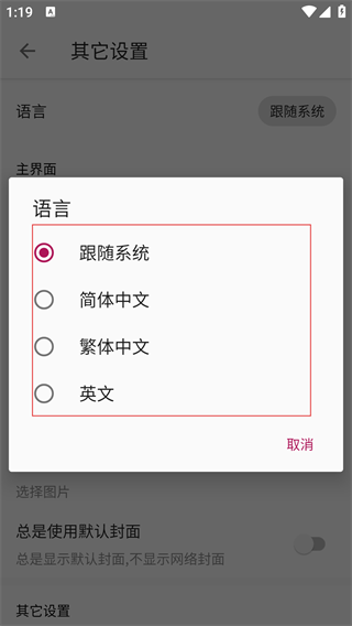 4、在语言选择界面,可选择【跟随系统】【简体中文】【繁体中文】【英文】等语言模式,选择后即可应用该语言设置。