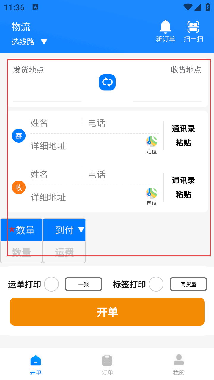 2、在开单页,填【发货地点】【收货地点】及寄收方姓名、电话、地址,完善物流信息。